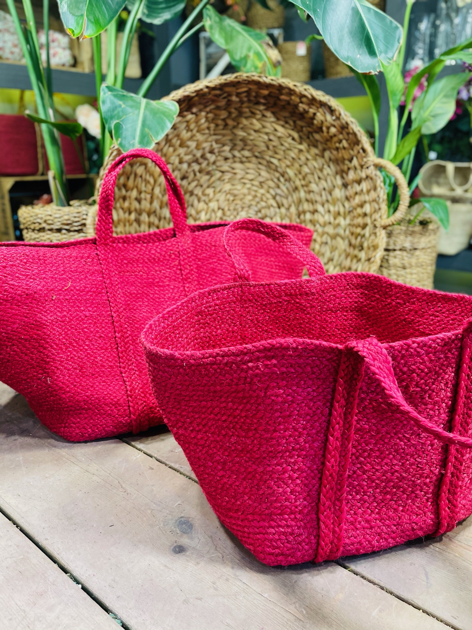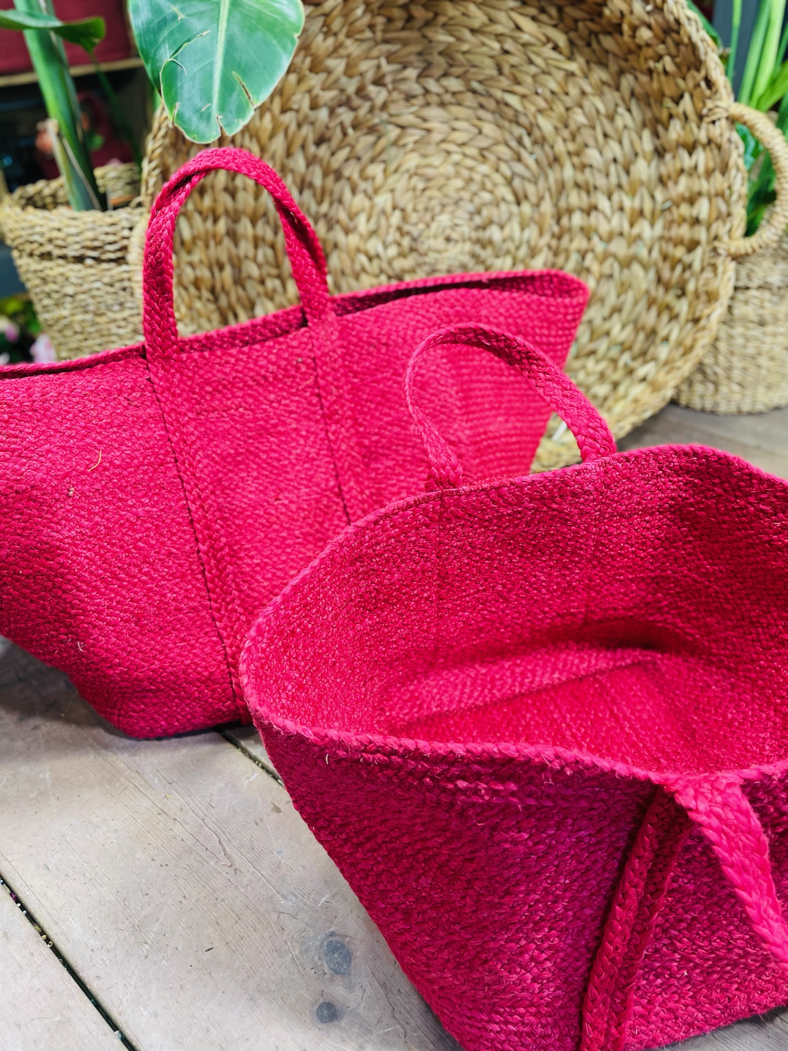 Bonito bolso de Yute de color rojo trenzado y cosido. Resistente en costuras para un uso exigente y de gran capacidad 35H x 39diam