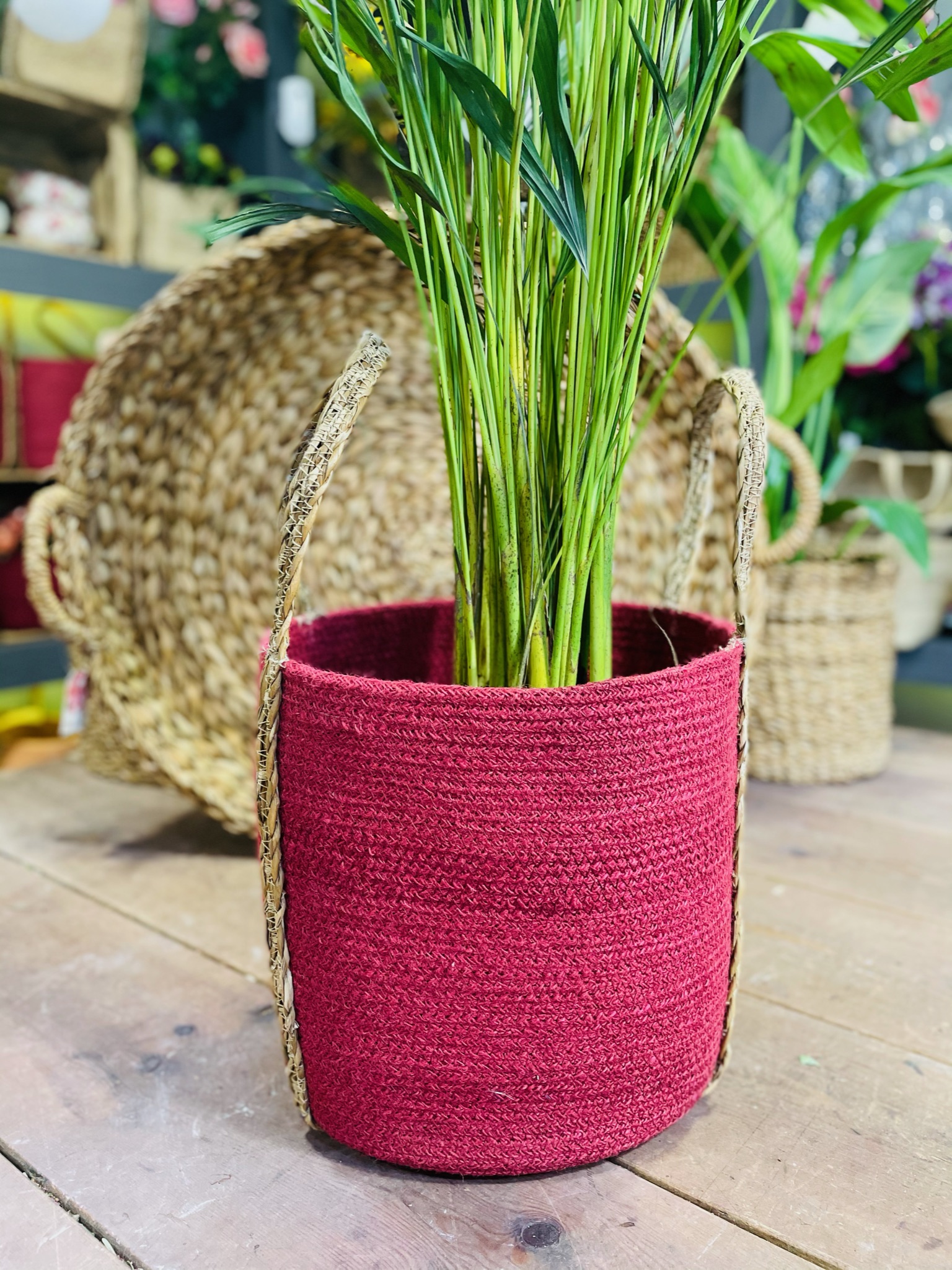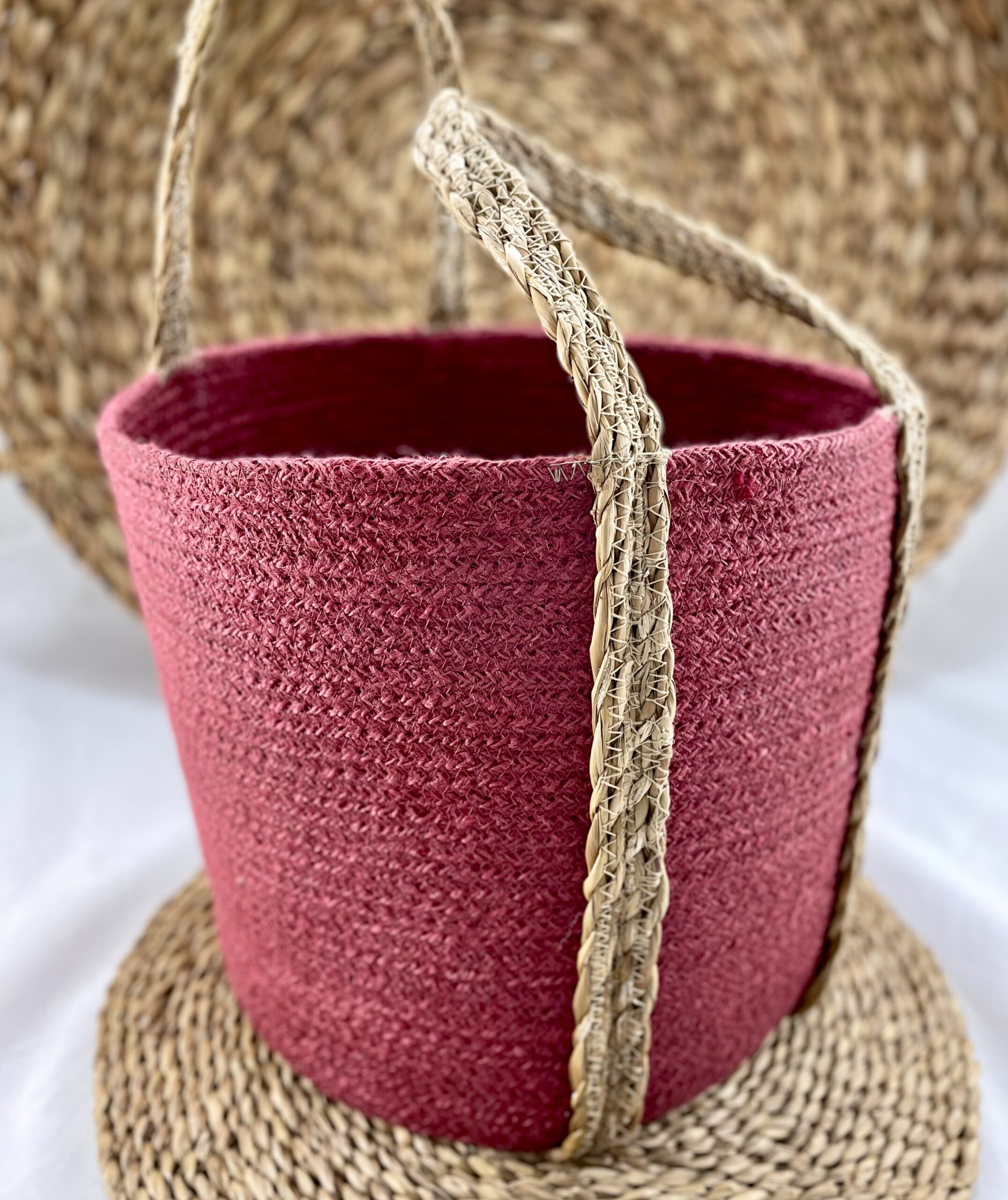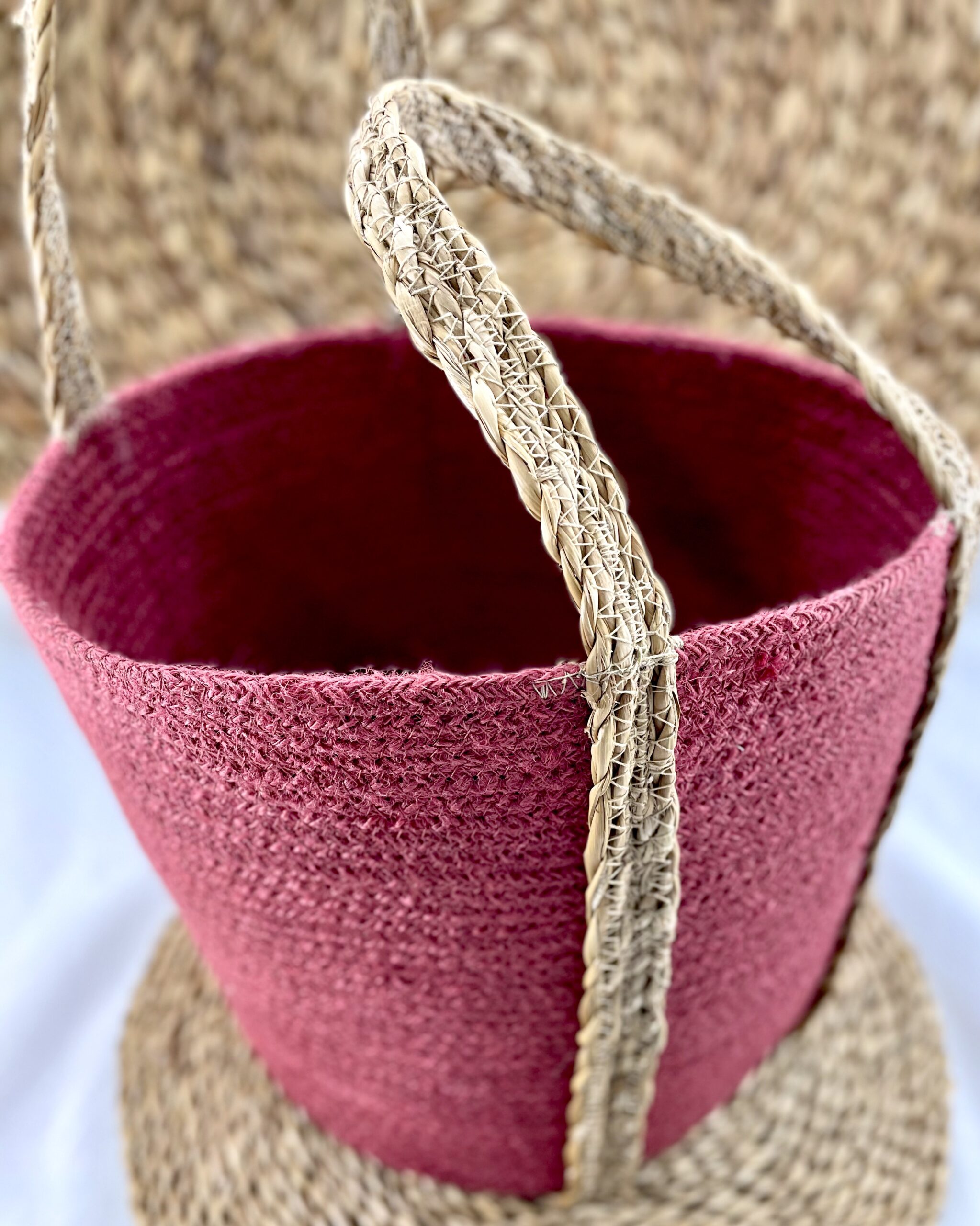 Cesto de Yute trenzado y con Asas de Hogla, buen tamaño para macetero o simplemente bolso. Bonito diseño y realizado artesanalmente 26H x 25 diam.